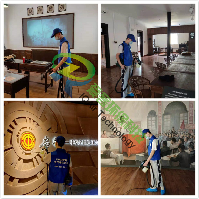 愛客工程師們對紀(jì)念館一、二樓展區(qū)地板、墻面、翻新門窗表面逐一噴灑愛客濃縮型異味分解酶(食品級)與強(qiáng)力TVOC清除劑(食品級),以消除化學(xué)異味分子,降解甲醛及TVOC。并結(jié)合紫外線燈進(jìn)行殺菌消毒治理。